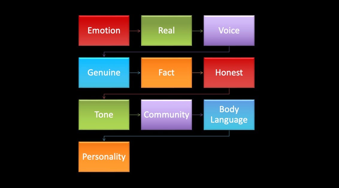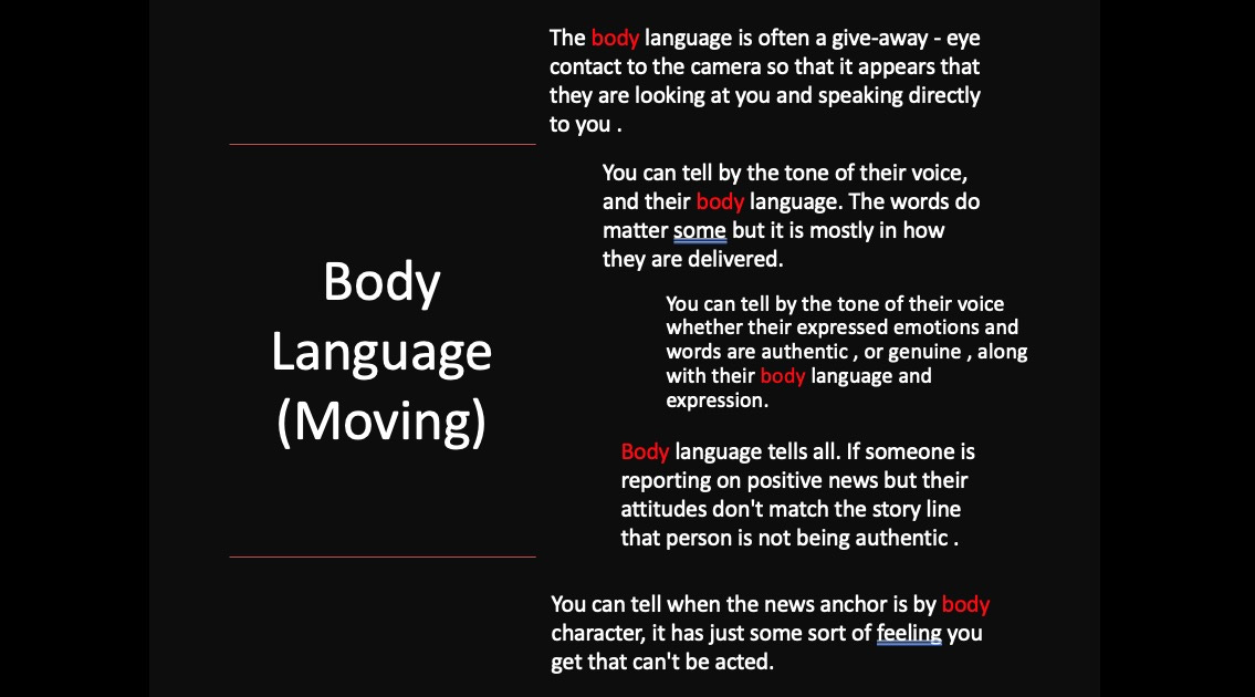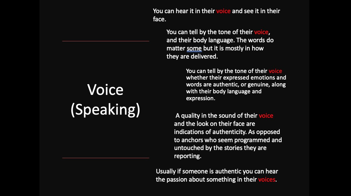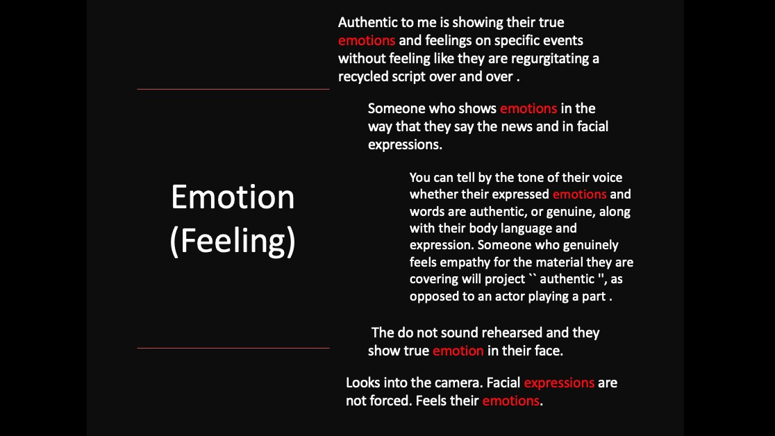 If you’re looking for inspiration, it can help to know something about the story viewers themselves tell about authenticity. In research, when we ask how they can tell when an anchor is being authentic, here are the words they use the most.